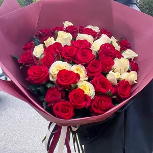 Заманчивая нежность – букет из кустовых хризантем и роз, альстромерий и эустом