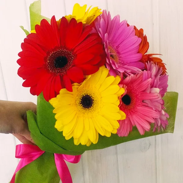 поможет солнечное сочетание пестрых гербер. Нежно розовый цвет намекнет о симпатии, желтый о дружеском интересе, оранжево-красный станет комплиментом, а насыщенно-розовый