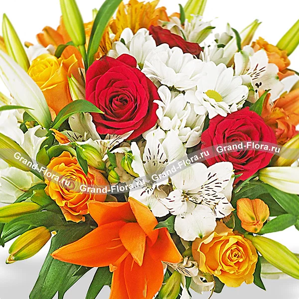 Стандартный (на фото): лилия желтая - 3 шт.,  роза желтая - 4 шт., роза красная - 3 шт., альстромерия белая  - 3 шт., хризантема кустовая ромашковая (белая) - 1 шт., сетка желтая.