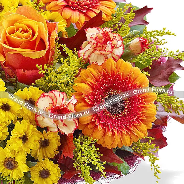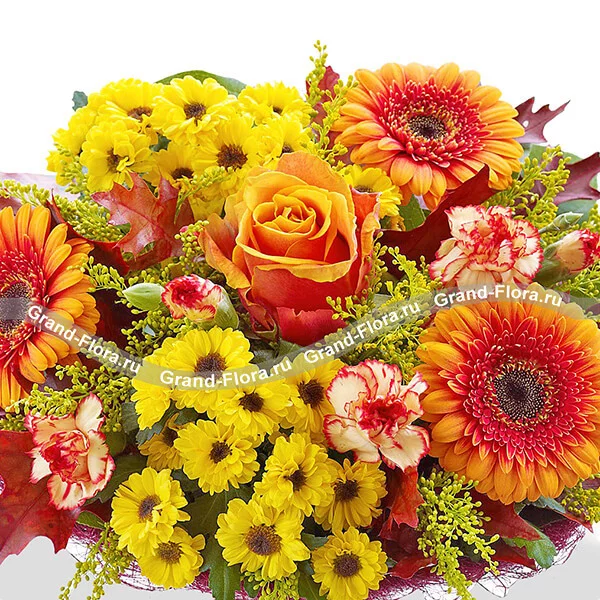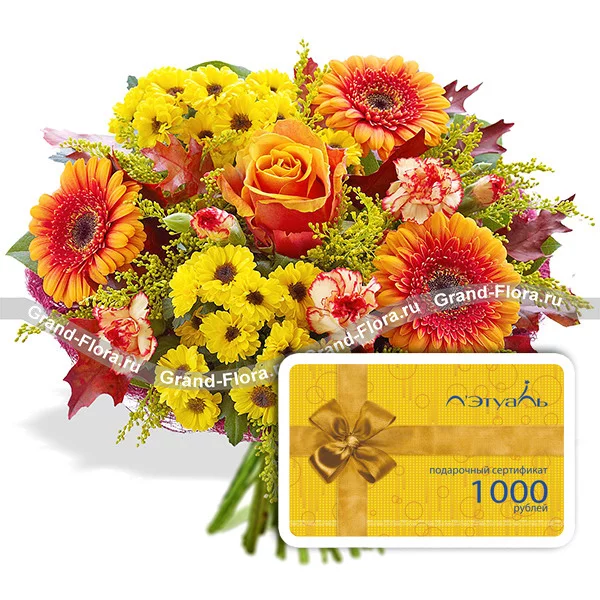 Стандартный (на фото): подарочный сертификат магазина Летуаль на сумму 1000р., роза оранжевая - 1 шт., гербера оранжевая - 3 шт., хризантема желтая кустовая (мелкоцветная) - 2 шт., гвоздика кустовая оранжевая - 2 шт., солидаго - 3 шт., сетка бордовая.
