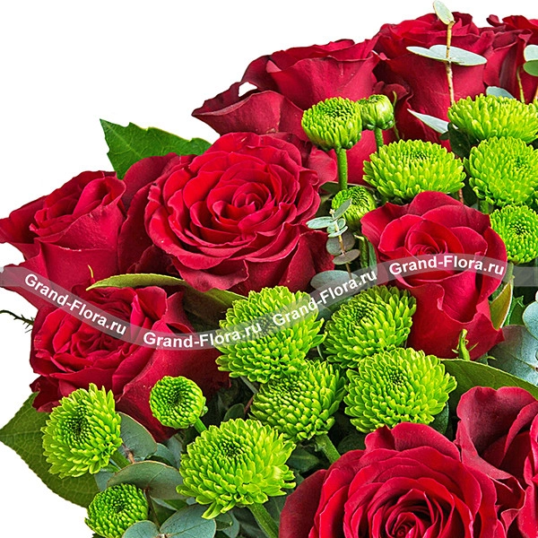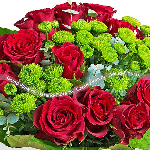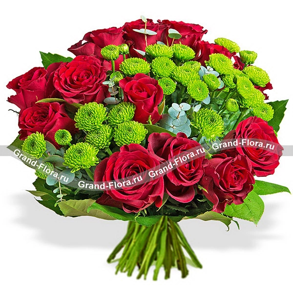 Букет состоит из классических красных роз, насыщенного оттенка, сорта Гран При и стильных хризантем сантини. Беспроигрышное сочетание красных роз и зеленых хризантем удачно дополнено эквалиптом и салалом.