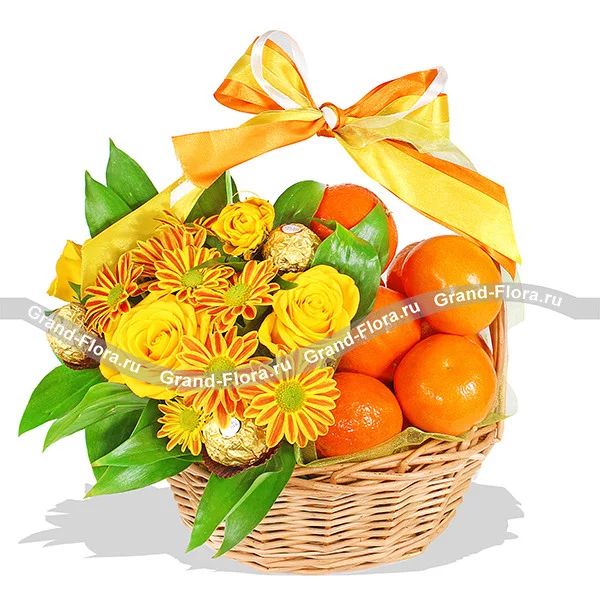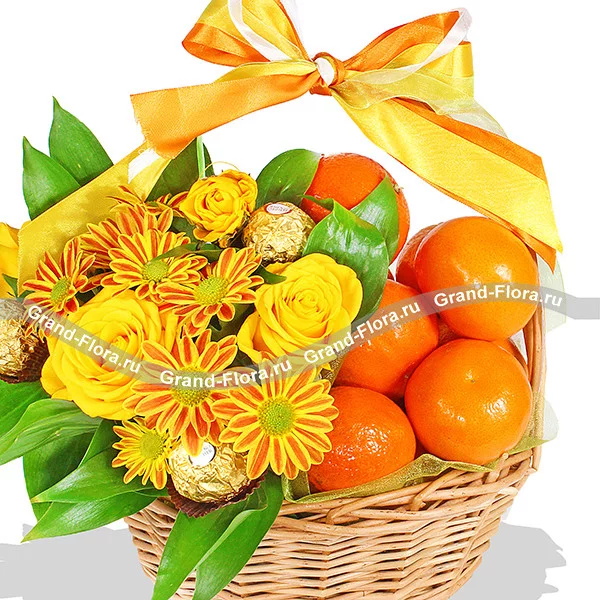 Стандартный (на фото): хризантема кустовая оранжевая - 2 шт, роза кустовая желтая - 1 шт., мандарины - 1 кг (возможна замена на апельсины), конфеты Ferrero Rocher, рускус, оазис - 0,5 кирпича, лента , корзинка.