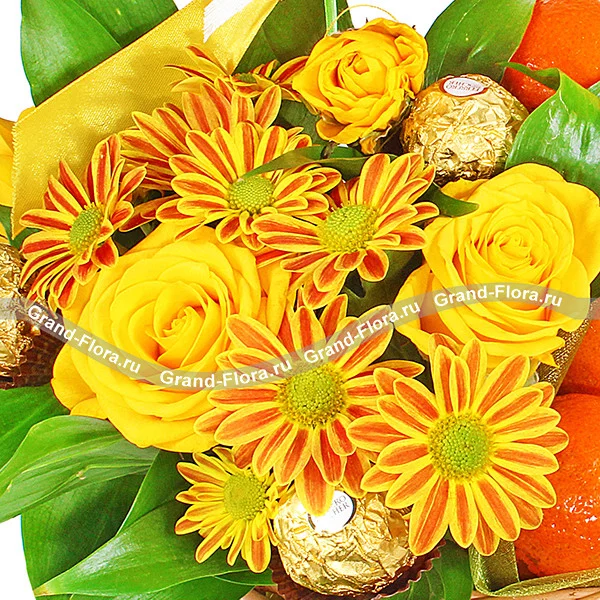 ЛЮКС: хризантема кустовая оранжевая - 5 шт, роза кустовая желтая - 4 шт, мандарины - 2 кг (возможна замена на апельсины), конфеты Ferrero Rocher, рускус, оазис, лента , корзинка.