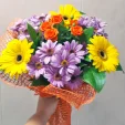 Аккуратный и стильный  букет непременно вызовет восхищение своего счастливого обладателя. Сочетание оранжевых кустовых роз и фиолетовой хризантемы на фоне крупных цветков желтой герберы подчёркнуто насыщенно-зелёными листьями салала. Совершенство можно подарить, когда оно воплощено в цветах.
