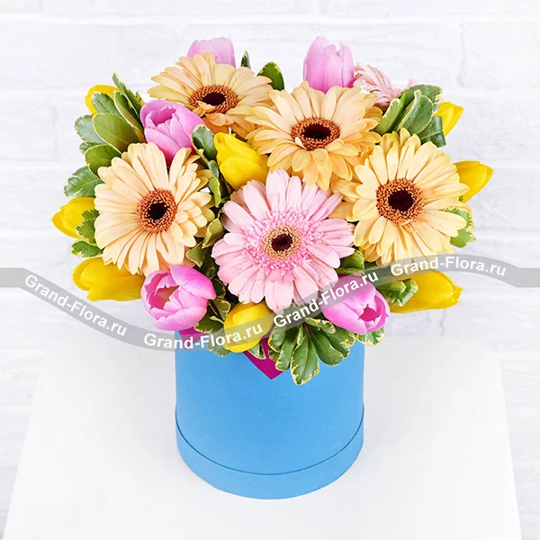 Стандартный: гербера желтая - 4 шт., гербера розовая - 2 шт., тюльпан желтый - 8 шт., тюльпан розовый - 5 шт., зелень, оазис, коробка.