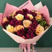 (на фото): роза кремовая/персиковая(персиково-розовая) - 15 шт., хризантема фиолетовая - 8 шт., декоративная зелень, упаковка, лента Примерный размер: 35Х35 см.